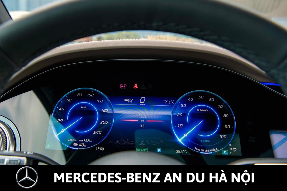 - Màn hình giải trí MBUX Hyperscreen với bảng đồng hồ kỹ thuật số 12,3-inch sau vô lăng, màn hình giải trí trung tâm OLED 17,7-inch (điều khiển cảm ứng) & màn hình hiển thị thông tin phía trước ghế phụ OLED 12,3-inch (điều khiển cảm ứng)
